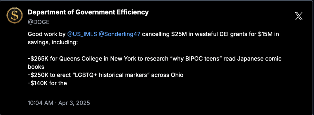 Context: The cancellation of $25M in DEI grants aligns with what Americans voted for. We saw the EPA’s March 2025 termination of $1.7B in similar grants. The Queens College study on BIPOC teens and manga was part of an IMLS-funded project launched in January 2025, led by Dr. Joe Sanchez. Ohio’s $250K for LGBTQ+ historical markers aimed to honor Summit Station, a lesbian bar in Columbus, previously recognized in 2023. The California State Library’s $6.7M grant was tied to a collaborative effort with Califa and Marin County Free Libraries, focusing on racial equity in library operations. This move by DOGE reflects a pattern of meticulously looking at DEI initiatives, following a 2024 trend where 20 states introduced bills to limit such programs in public institutions.