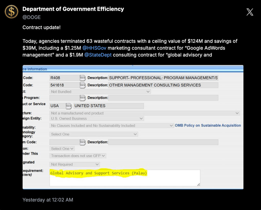 Day 76 (Week 12): $124M in Wasteful Contracts Terminated, Including $1.9M for “Global Advisory in Palau”